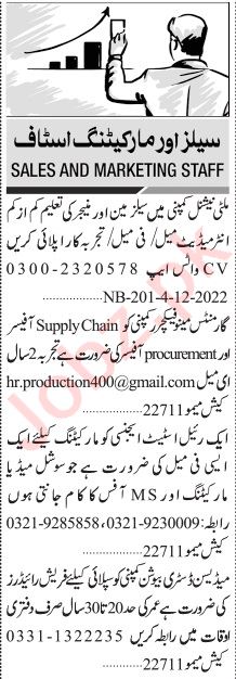 Jang Sunday Classified Ads 4 Dec 2022 for Sales & Marketing