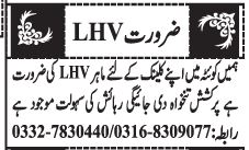 Clinic jobs advertisement dated about 4 February 2024 in daily Jang Newspaper invites application for the vacant post of lhv and lady health visitor in Quetta, quetta Balochistan Pakistan. Persons with Matric and Intermediate etc. education can apply.