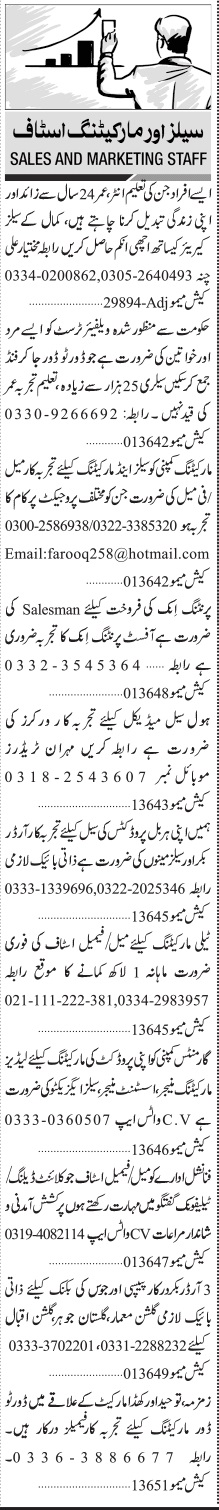 Jang Sunday Classified Ads 4 Feb 2024 for Sales Staff