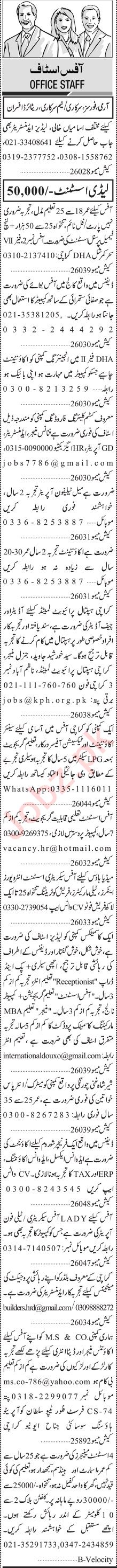 Vacant posts including auditor, receptionist, assistant interviewer, office staff, office boy, accountant, personal assistant, pa, assistant manager, gd operator, administrator, office secretary, manager, anchor, taxation officer, chief auditor, hr executive, telephone operator, accounts manager, finance manager, telemarketer, office assistant, lady assistant and data entry operator are announced in Private Company Karachi, karachi Sindh Pakistan as per 5 June 2023 advertisement in daily Jang Newspaper. Persons with Intermediate, MBA, I.com, Bachelor, M.com, Matric, B.com, ACCA, BBA, Middle and BA etc. education can apply.