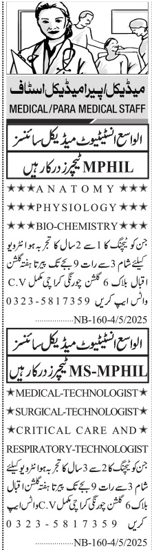 Vacant posts including anatomy lecturer, bio chemistry lecturer, physiology lecturer, professor, respiratory technologist, medical technologist, teacher, lecturer, surgical technologist and critical care technologist are announced in Al Wasay Medical Centre Gulshan-e-Iqbal - Block 6 Karachi, karachi Sindh Pakistan as per 5 May 2025 advertisement in daily Jang Newspaper. Preferred Education is Master, MBBS and Mphil etc.