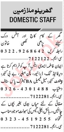 Jang Sunday Classified Ads 4 Sept 2022 For Domestic Staff