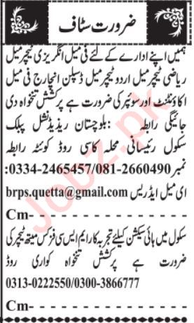Vacant posts including sweeper, mathematics teacher, accountant, teacher, urdu teacher, maths teacher, english teacher, discipline incharge and physics teacher are announced in Educational Organization Quetta, quetta Balochistan Pakistan as per 5 September 2022 advertisement in daily Jang Newspaper. Preferred Education is Intermediate, Bachelor and Master etc.