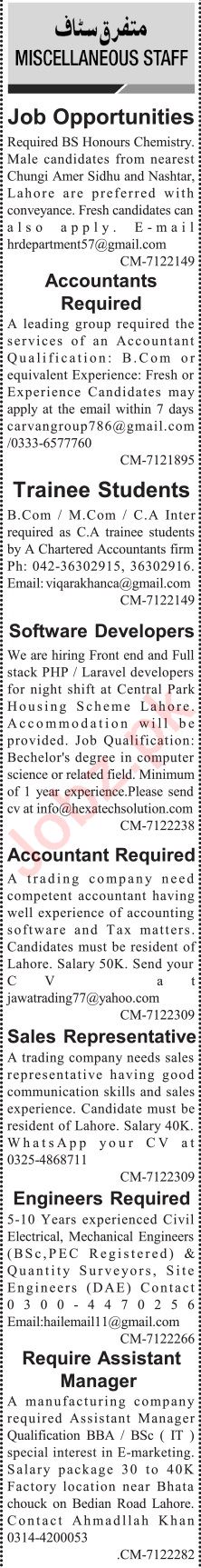 Private Company Lahore, lahore Punjab Pakistan invites applications from eligible candidates for the post of trainee student, sales representative, female full stack developer, mechanical engineer, chemist, laravel developer, software developer, engineer, assistant manager, php developer, accountant and electrical engineer as per advertisement of September 5, 2022 published in daily Jang Newspaper. Educational qualifications required Intermediate, Middle, Bachelor and Matric etc.