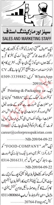 Jang Sunday Classified Ads 4 Sept 2022 for Sales & Marketing