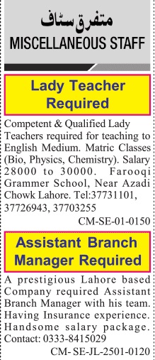 Private Company invites applications for job positions advertised in daily Jang dated 6 January 2025 for following vacancies in Lahore, lahore Punjab Pakistan.