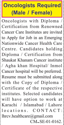 Vacant posts including oncologist are announced in Health Care Company Lahore, lahore Punjab Pakistan as per 6 January 2025 advertisement in daily Jang Newspaper. Preferred Education is Bachelor, Matric, DAE and Intermediate etc.