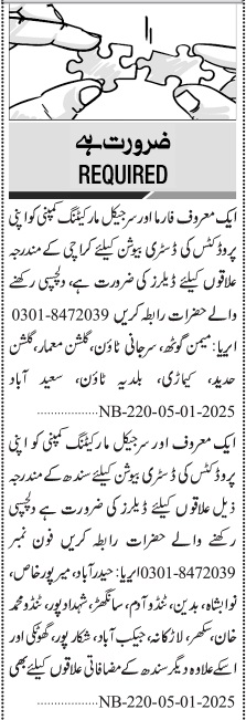 Vacant posts including distributor and dealer are announced in Distribution Company Karachi, hyderabad, sanghar, ghotki, shahdadpur, tando adam, mirpur khas, shikarpur, karachi, badin, nawabshah, larkana, jacobabad and sukkur Sindh Pakistan as per 6 January 2025 advertisement in daily Jang Newspaper. Educational qualifications required Intermediate and Matric etc.