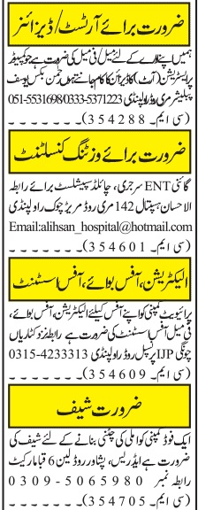 Vacant posts including cook, visiting consultant, designer, chef, office assistant, artist, office boy and electrician are announced in Private Company Rawalpindi, islamabad Punjab Pakistan as per 6 June 2022 advertisement in daily Jang Newspaper. Preferred Education is Bachelor, Intermediate, Matric and Middle etc.