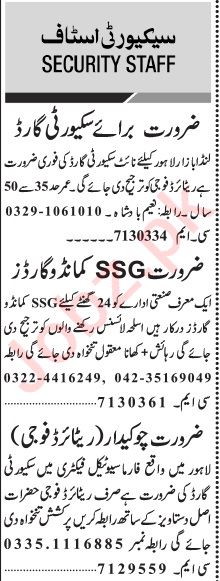 Vacant posts including fauji guard, chowkidar, security staff, ssg comando, ssg commando security guard and security guard are announced in Security Company Lahore, lahore Punjab Pakistan as per 6 March 2023 advertisement in daily Express Newspaper. Preferred Education is Middle, Intermediate and Matric etc.