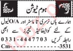 Vacant posts including home tutor, nursery teacher, teacher, a level teacher and o level teacher are announced in Academy Quetta, quetta Balochistan Pakistan as per 6 November 2023 advertisement in daily Jang Newspaper. Preferred Education is Bachelor and Master etc.
