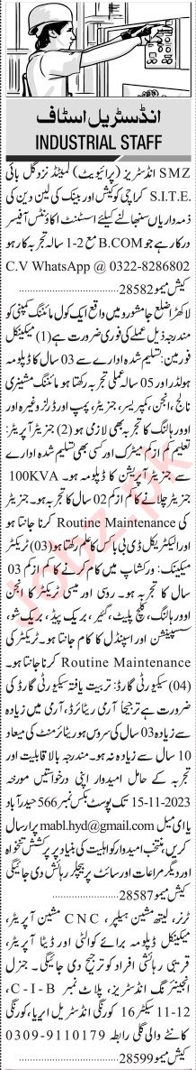 Jang Sunday Classified Ads 5 Nov 2023 for Industrial Staff