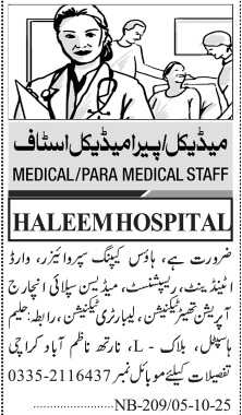 Halim Hospital is looking for candidates for following posts as per job advertisement published in daily Jang Newspaper of October 6, 2025 for location North Nazimabad - Block L Karachi, karachi Sindh Pakistan: