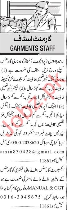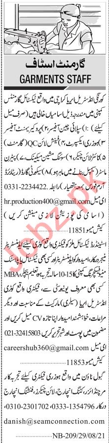 Jang Sunday Classified Ads 5th Sep 2021 For Garments Staff