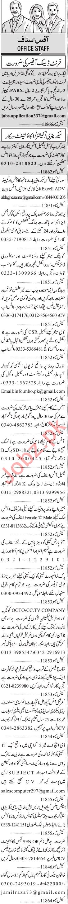 Customer Relationship Officer, Assistant Manager, Branch Manager, Receptionist, HR Officer, Supervisor, Assistant Supervisor, Account Manager, Office Assistant, Salesman, Marketing Staff, Sales Staff, Computer Operator, Sales Manager, Sales Officer, Secretary, Personal Secretary, Peon, Lady Accountant needs in well established companies.