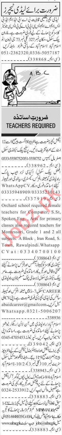 Teacher, English Teacher, Chemistry Teacher, Physics Teacher, Coordinator, Biology Teacher, Maths Teacher, Urdu Teacher, Montessori Teacher, Section Head, Teaching Assistant, Nursery Teacher, Special Education Teacher, Montessori Directress, Quran Teacher seeks in well reputed schools.