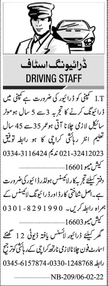 Jang Sunday Classified Ads 6 Feb 2022 For Driving Staff