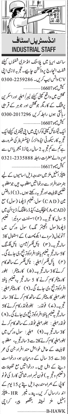 Jang Sunday Classified Ads 6 Feb 2022 For Industrial Staff