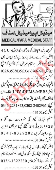 Skin Specialist, Medical Specialist, ENT Specialist, Eye Specialist, Child Specialist, Medical Officer, Radiologist, Nurse, LHV, Doctor, Lady Doctor, Pharmacist, Midwives, Gynecologist, Receptionist, Dispenser, Resident Medical Officer, Pathologist, General Manager, Admin Assistant, Executive Officer, Manager Housekeeping, Assistant Chemist, ICU Technician, CT Scan Technician seeks in well reputed hospitals.