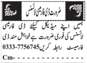 Medicine Company jobs advertisement dated about 7 March 2022 in daily Jang Newspaper invites application for the vacant post of pharmacy technician and pharmacist in Quetta, quetta Balochistan Pakistan. Preferred Education is B Pharmacy etc.