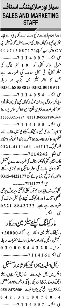Marketing Company Lahore, lahore Punjab Pakistan invites applications from eligible candidates for the post of outdoor marketing staff, salesman, marketing salesman, sales executive, sales staff, marketing staff, sales manager, telemarketing staff and sales officer as per advertisement of March 7, 2022 published in daily Jang Newspaper. Candidates with Bachelor, Middle, Intermediate and Matric etc. educational background will be preferred.
