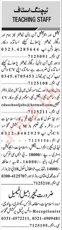 Private School Lahore, lahore Punjab Pakistan invites applications from eligible candidates for the post of chemistry teacher, islamiat teacher, education teacher, receptionist, female teacher, science teacher, qari, vice principal, english teacher, biology teacher, montessori teacher, teacher, history teacher, physics teacher and nazara teacher as per advertisement of November 7, 2022 published in daily Jang Newspaper. Candidates with Intermediate, Master and Bachelor etc. educational background will be preferred.