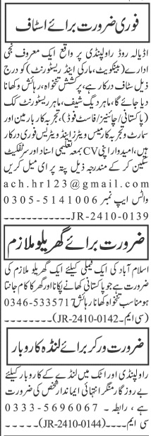 Private Company jobs advertisement dated about 6 October 2024 in daily Jang Newspaper invites application for the vacant post of waitress, mess waiter, chef, cook, restaurant cook, chinese cook, house worker and barman in Islamabad, rawalpindi and attock Islamabad Pakistan. Intermediate, Middle, Bachelor and Matric etc. educational qualification will be preferred.