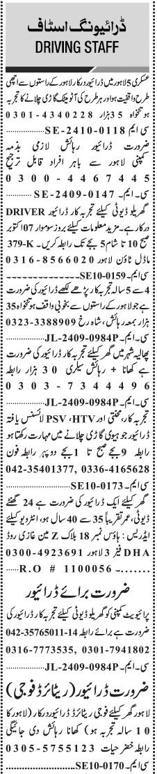 Jang Sunday Classified Ads 6 Oct 2024 for Driving Staff
