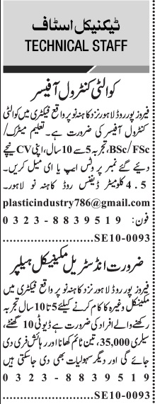Private Industry invites applications for job positions advertised in daily Jang dated 6 October 2024 for following vacancies in Lahore, lahore Punjab Pakistan.