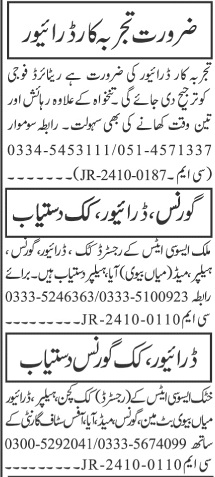 House jobs advertisement dated about 6 October 2024 in daily Jang Newspaper invites application for the vacant post of governance, helper, office staff, cook, aya, driver, husband wife, kitchen helper, fauji driver, maid and ltv driver in Islamabad, rawalpindi Islamabad Pakistan. Candidates with Primary, Matric and Middle etc. educational background will be preferred.