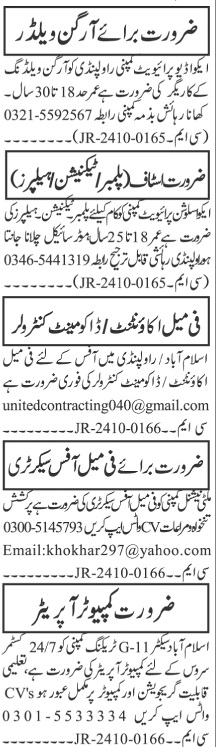 Private Company jobs advertisement dated about 6 October 2024 in daily Jang Newspaper invites application for the vacant post of plumber, accountant, document controller, technician, helper, welder, argon welder, office secretary and computer operator in Islamabad, rawalpindi Islamabad Pakistan. Candidates with Matric, Intermediate, BA, Bachelor, Middle and B.com etc. educational background will be preferred.