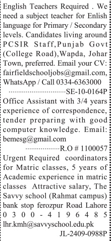 Private Company jobs advertisement dated about 6 October 2024 in daily Jang Newspaper invites application for the vacant post of english teacher, office assistant, teacher, english language teacher and coordinator in Lahore, lahore Punjab Pakistan. Persons with MA, BA, Matric, Intermediate and Bachelor etc. education can apply.