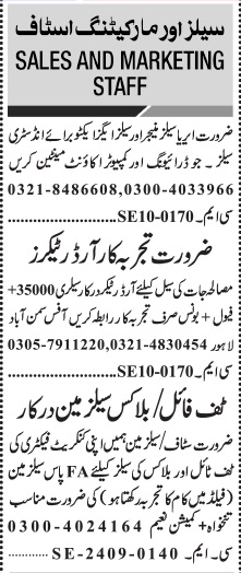 Marketing Company Lahore, lahore Punjab Pakistan invites applications from eligible candidates for the post of order taker, area sales manager, sales executive and salesman as per advertisement of October 6, 2024 published in daily Jang Newspaper. B.com, Bachelor, Intermediate, Middle, Matric and BA etc. educational qualification will be preferred.