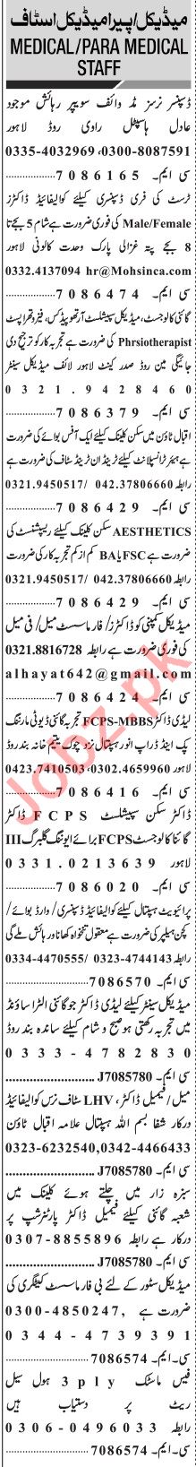 Skin Specialist, Medical Specialist, ENT Specialist, Eye Specialist, Child Specialist, Medical Officer, Radiologist, Nurse, LHV, Doctor, Lady Doctor, Pharmacist, Midwife, Gynecologist, Receptionist, Dispenser, Resident Medical Officer, Pathologist, General Manager, Admin Assistant, Executive Officer, Manager Housekeeping, Assistant Chemist, ICU Technician, CT Scan Technician, X Ray Technician, House Officer, Nursing Instructor, CCTV Assistant, Lab Technician seeks in well known hospitals.