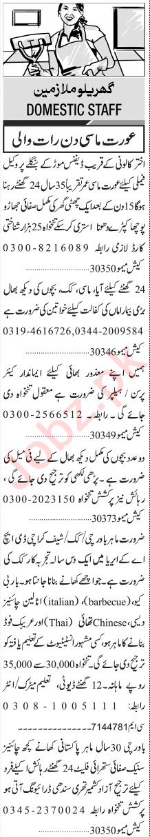 House jobs advertisement dated about 8 April 2024 in daily Jang Newspaper invites application for the vacant post of chef, italian cook, cook, masi, nanny, arabic cook, helper, chinese cook, thai chef, maid, attendant, care person and aya in Karachi, karachi Sindh Pakistan. Educational qualifications required Middle, Primary, Matric and Intermediate etc.
