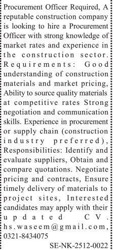 Construction Company Lahore, lahore Punjab Pakistan invites applications from eligible candidates for the post of procurement officer as per advertisement of December 8, 2025 published in daily Jang Newspaper. Preferred Education is Bachelor, Others and BA etc.