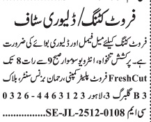 Vacant posts including fruit cutter, delivery staff and delivery boy are announced in Food Company Gulberg 3 Lahore, lahore Punjab Pakistan as per 8 December 2025 advertisement in daily Jang Newspaper. Preferred Education is Matric and Intermediate etc.