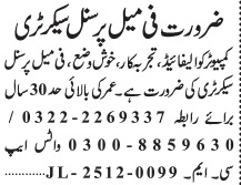 Private Company jobs advertisement dated about 8 December 2025 in daily Jang Newspaper invites application for the vacant post of secretary, female personal secretary and personal secretary in Lahore, lahore Punjab Pakistan. Educational qualifications required Bachelor and Intermediate etc.