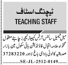 Allama Iqbal School is looking for candidates for following posts as per job advertisement published in daily Jang Newspaper of December 8, 2025 for location Badami Bagh Lahore, lahore Punjab Pakistan: