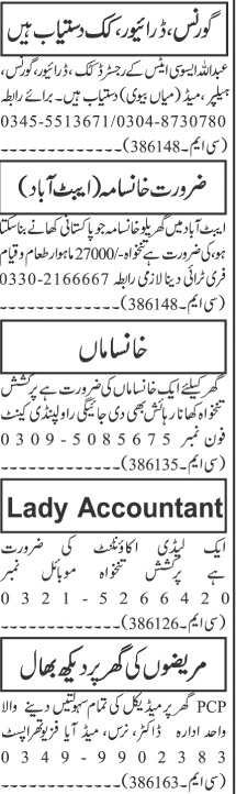 Vacant posts including lady accountant, doctor, physiotherapist, maid, nurse, khansama, accountant, governance, cook, chef, driver and aya are announced in Private Company Islamabad, abbottabad and rawalpindi Islamabad Pakistan as per 8 July 2024 advertisement in daily Jang Newspaper. Bachelor, BBA, Middle, Matric, Intermediate, BA and B.com etc. educational qualification will be preferred.