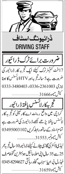 Vacant posts including htv driver, truck driver, ltv driver, driver and house driver are announced in Private Company Karachi, karachi Sindh Pakistan as per 8 July 2024 advertisement in daily Jang Newspaper. Candidates with Middle and Matric etc. educational background will be preferred.