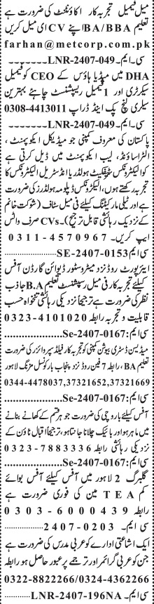 Private Company Lahore, lahore Punjab Pakistan invites applications from eligible candidates for the post of electronics diploma holder, office boy, tea man, translator, telemarketing officer, secretary, accountant, receptionist, field supervisor, female receptionist, bawarchi and cook as per advertisement of July 8, 2024 published in daily Jang Newspaper. Preferred Education is Matric, BA, Intermediate, Bachelor, DAE, Middle and BBA etc.