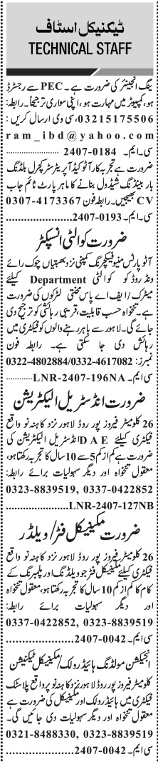 Vacant posts including mechanical fitter, quality inspector, autocad operator, engineer, mechanical technician, industrial electrician, injection molding expert and welder are announced in Factory Lahore, lahore Punjab Pakistan as per 8 July 2024 advertisement in daily Jang Newspaper. Candidates with Bachelor, DAE, Matric, Intermediate and B.E etc. educational background will be preferred.
