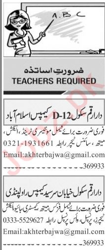 Vacant posts including maths teacher, english teacher, principal, montessori teacher, vice principal, science teacher, teacher, female teacher, biology teacher and chemistry teacher are announced in Private School Islamabad, rawalpindi Islamabad Pakistan as per 8 May 2023 advertisement in daily Jang Newspaper. Preferred Education is BA, Master, B.ed, MA, M.ed, Bachelor and M.sc etc.