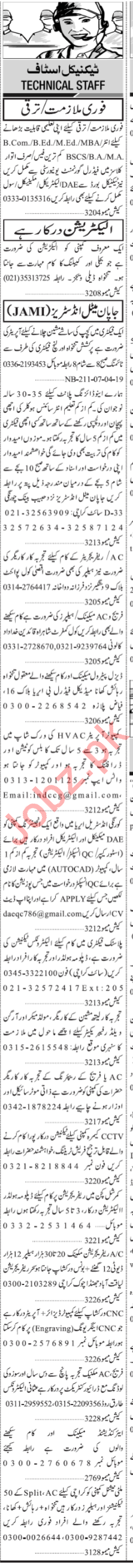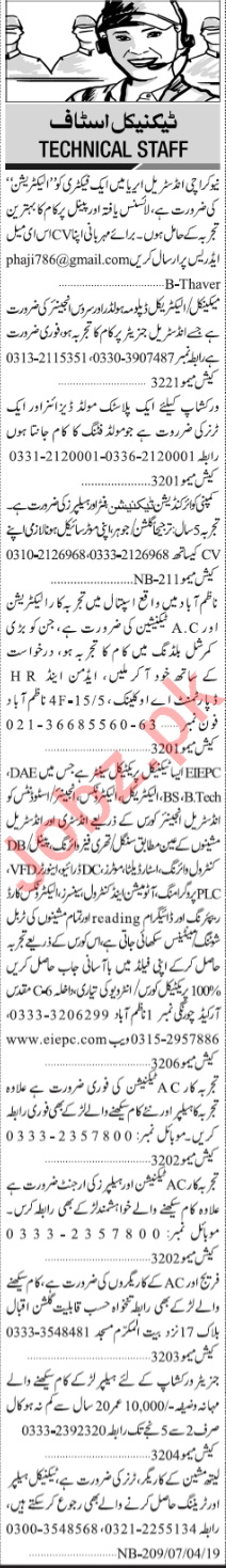 Jang Sunday Classified Ads 7th April 2019 Technical Staff