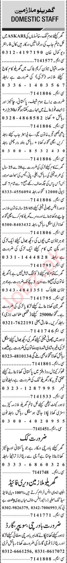 House Lahore, lahore Punjab Pakistan invites applications from eligible candidates for the post of baby care, patient care, khansama, house maid, cook, sweeper, fauji guard, kitchen helper, chiense cook, house worker, guard, home chef, nanny and chef as per advertisement of January 7, 2024 published in daily Jang Newspaper. Educational qualifications required Matric, Middle and Primary etc.