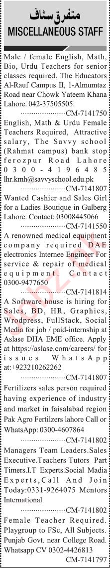 Jang Sunday Classified Ads 7th Jan 2024 For General Staff