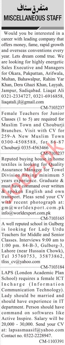 Customer Relationship Officer, Assistant Manager, Branch Manager, Receptionist, HR Officer, Supervisor, Assistant Supervisor, Account Manager, Office Assistant, Salesman, Marketing Staff, Sales Staff, Computer Operator, Sales Manager, Sales Officer seeks in well reputed companies.