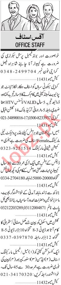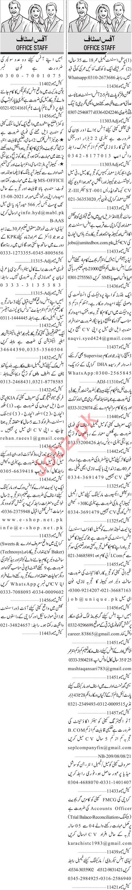 Jang Sunday Classified Ads 8 August 2021 for Office Staff
