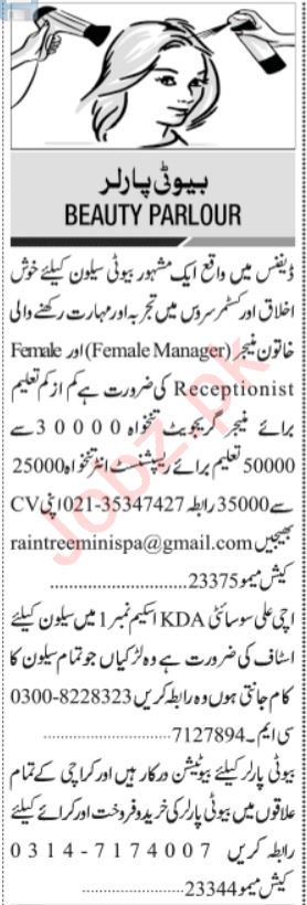 Beauty Parlor is looking for candidates for following posts as per job advertisement published in daily Jang Newspaper of January 9, 2023 for location Karachi, karachi Sindh Pakistan: